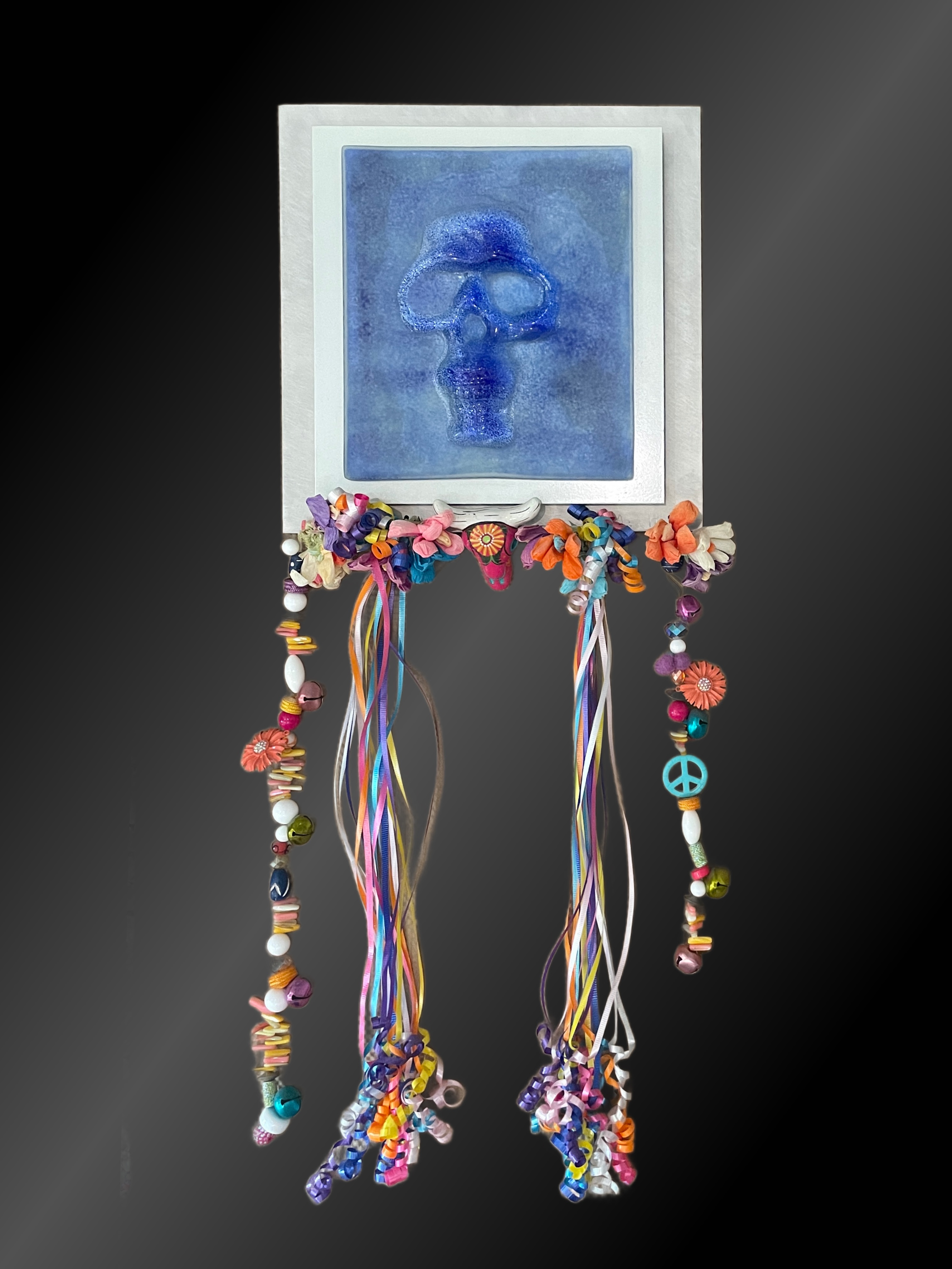 This fabulous Day of the Dead skull is very festive with the blue glass casting on a white background and festive colors.