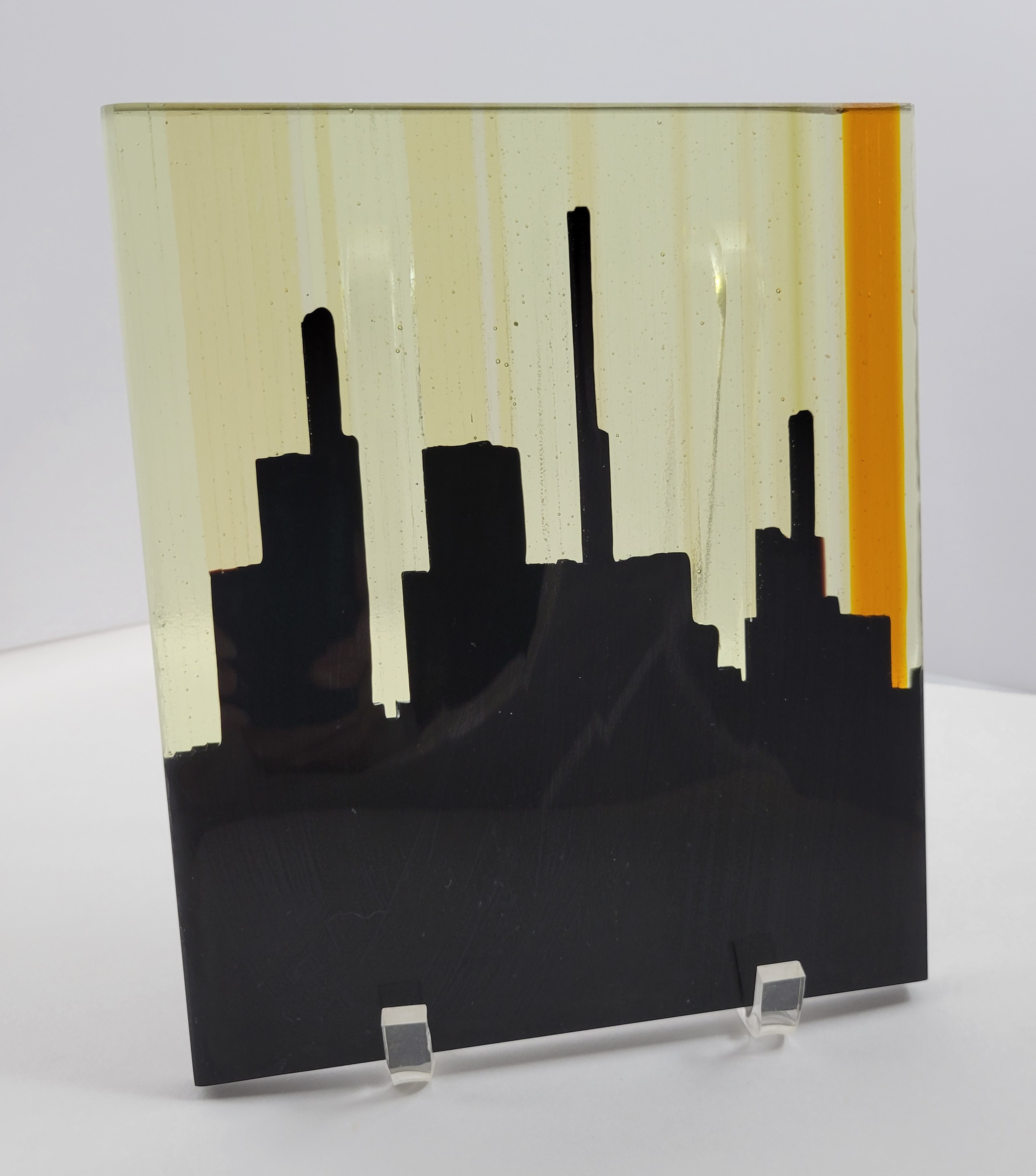 Fused glass panel featuring a bold city skyline in black silhouette against warm golden and amber tones, evoking an urban sunset with sleek, modern style. Measures 7 -1/2" x 8- 3/4" x 3/8".